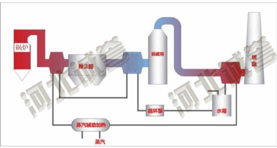 脫硫塔入口煙道設置煙氣冷卻系統(tǒng)吸收高溫煙氣中的熱量對熱媒加熱,加熱后熱媒進入脫硫塔出口煙氣加熱系統(tǒng)對煙氣加溫,經(jīng)加溫后的煙氣再排放,可顯著降低白煙視感。當脫硫塔前端煙氣熱量不足以加熱后部煙氣時,可通過蒸汽進行輔助加熱。